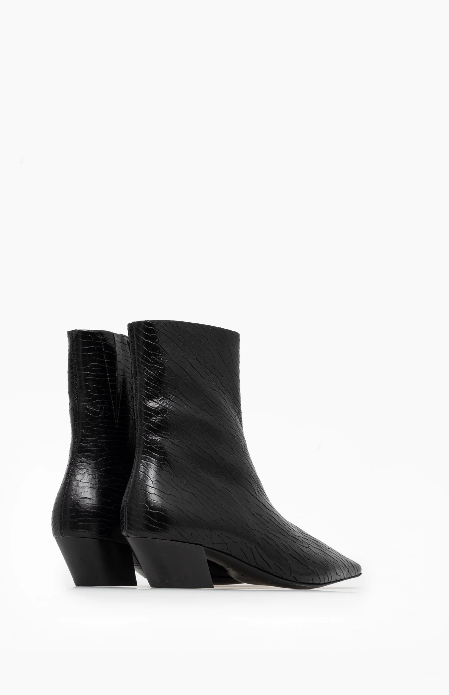 Designerskie czarne botki na obcasie. Wykonane z wysokiej jakości skóry, sprowadzanej z Włoch i montowanej w Polsce. Wyjątkowa struktura z tłoczeniem na wzór łusek, nadaje butom wyjątkowego charakteru i elegancji.