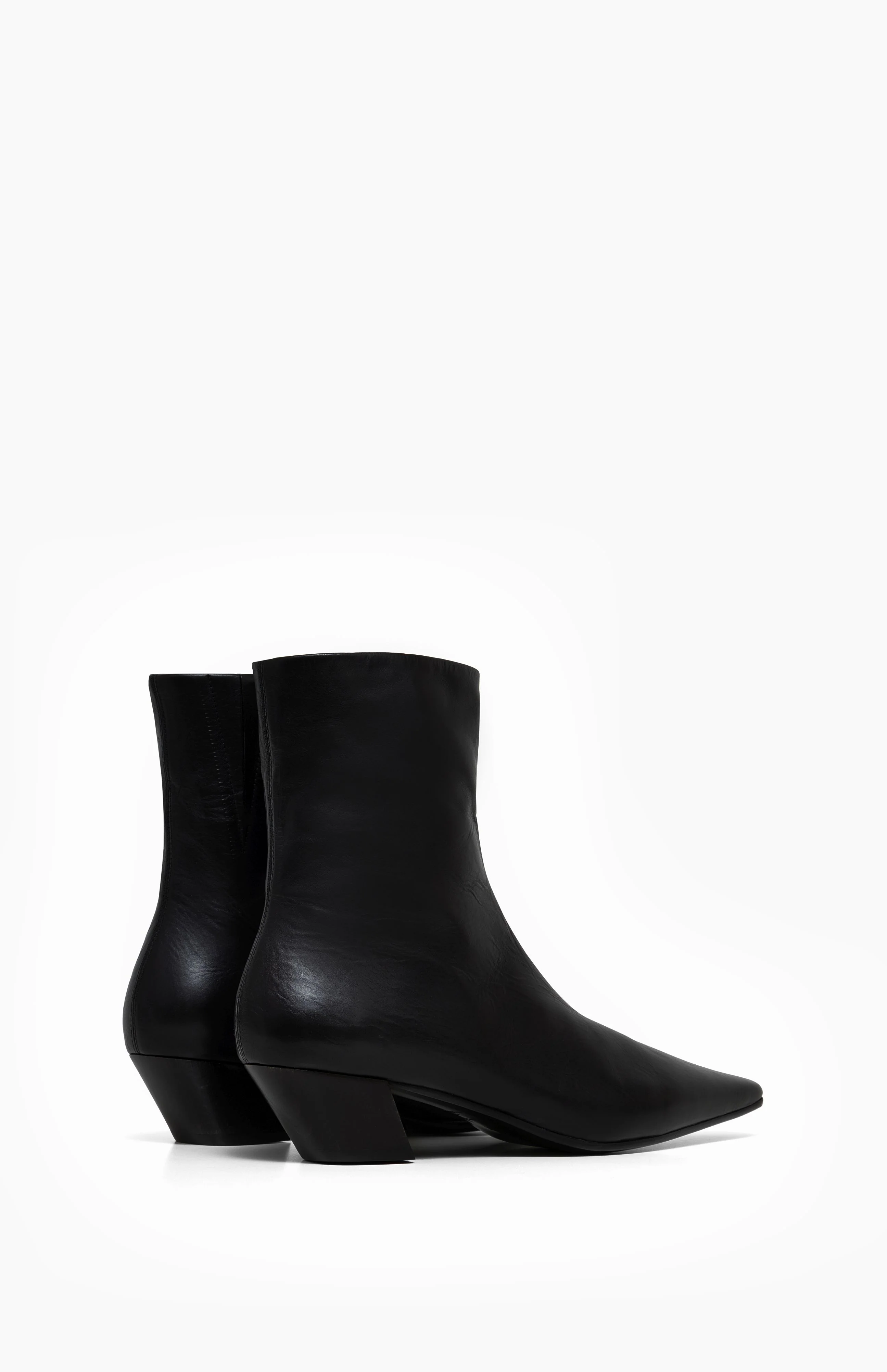 Minimalistyczne botki na obcasie. Uniwersalny krój został przełamany oryginalnymi detalami, takimi jak geometryczny, optycznie ścięty, 35-milimetrowy obcas oraz prostokątne noski.
