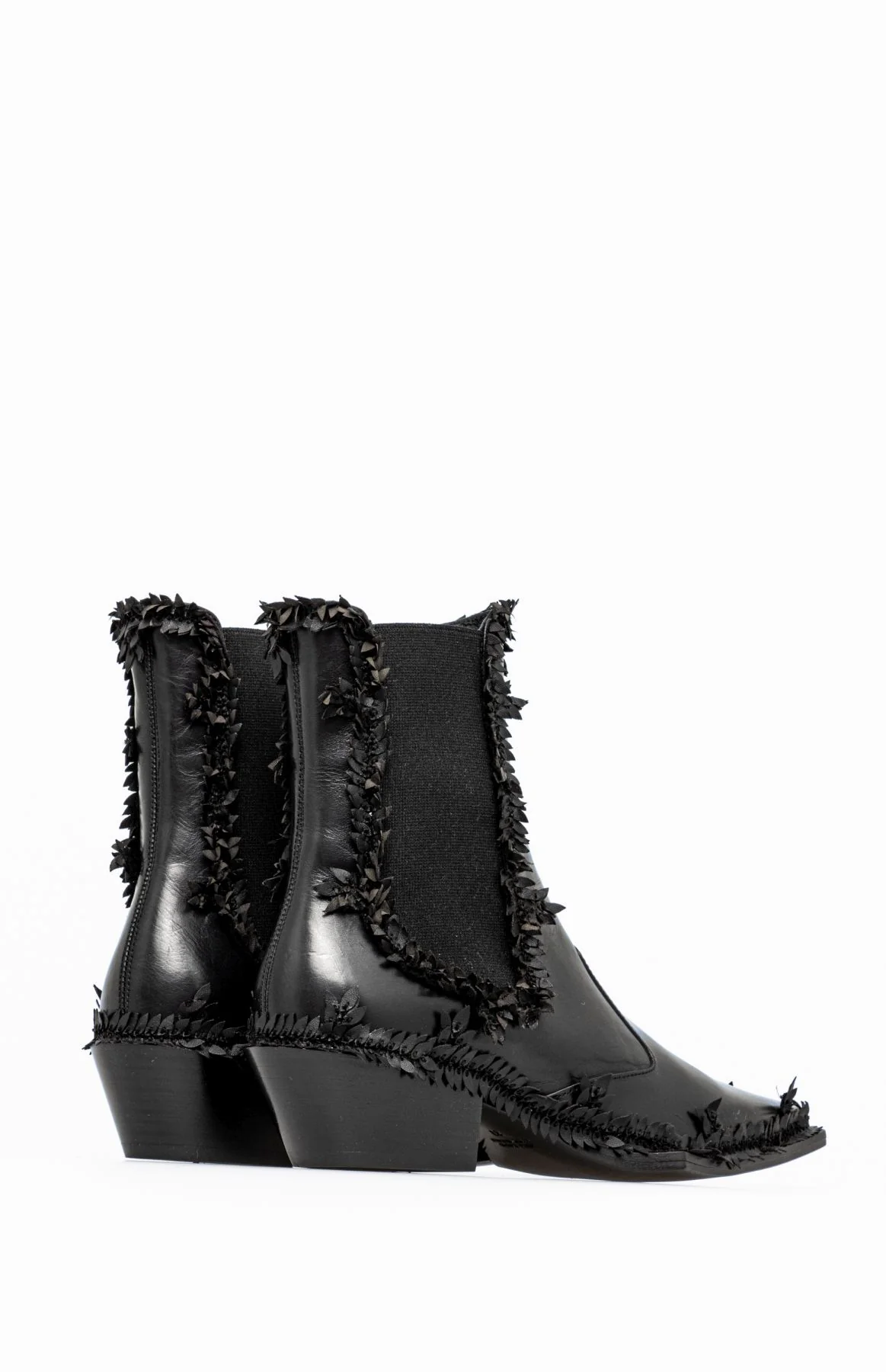 Czarne sztyblety na obcasie, będące oryginalnym odświeżeniem modelu z pierwszej jesiennej kolekcji Vanda Novak. Ozdobny motyw roślinny poprowadzony wzdłuż linii buta nadaje im kobiecości i lekkości.