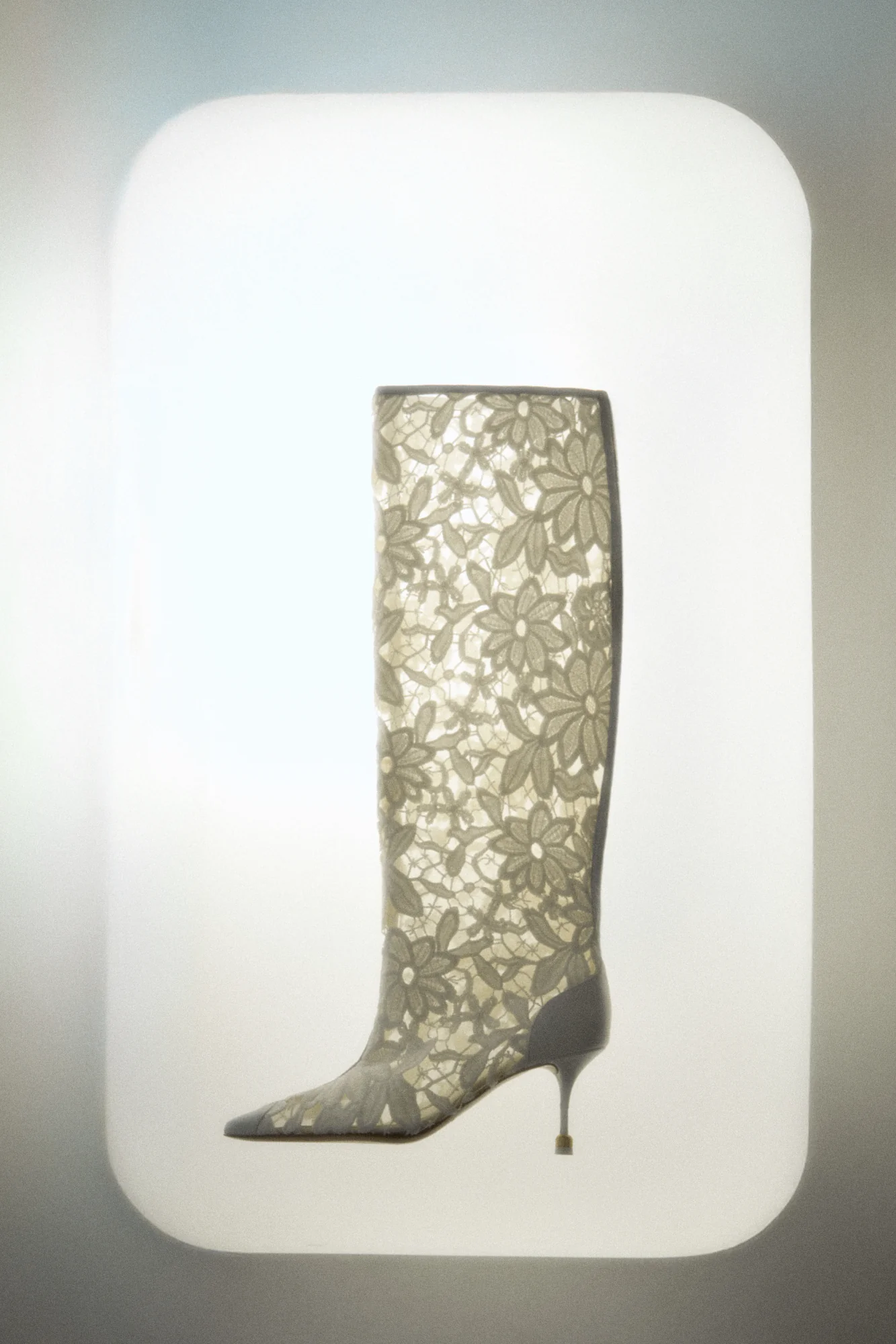 Wysoka cholewka wykonana z dekoracyjnej koronki tworzy efekt lekkiej struktury z wyraźnym motywem kwiatowym. Podbita siatką w odcieniu skóry, zyskuje głębię i stabilność. Ażurowa tkanina została wykończona lamówkami z naturalnej skóry, dzięki temu powierzchnia zachowuje swoją delikatność, a jednocześnie zyskuje elegancką linię.