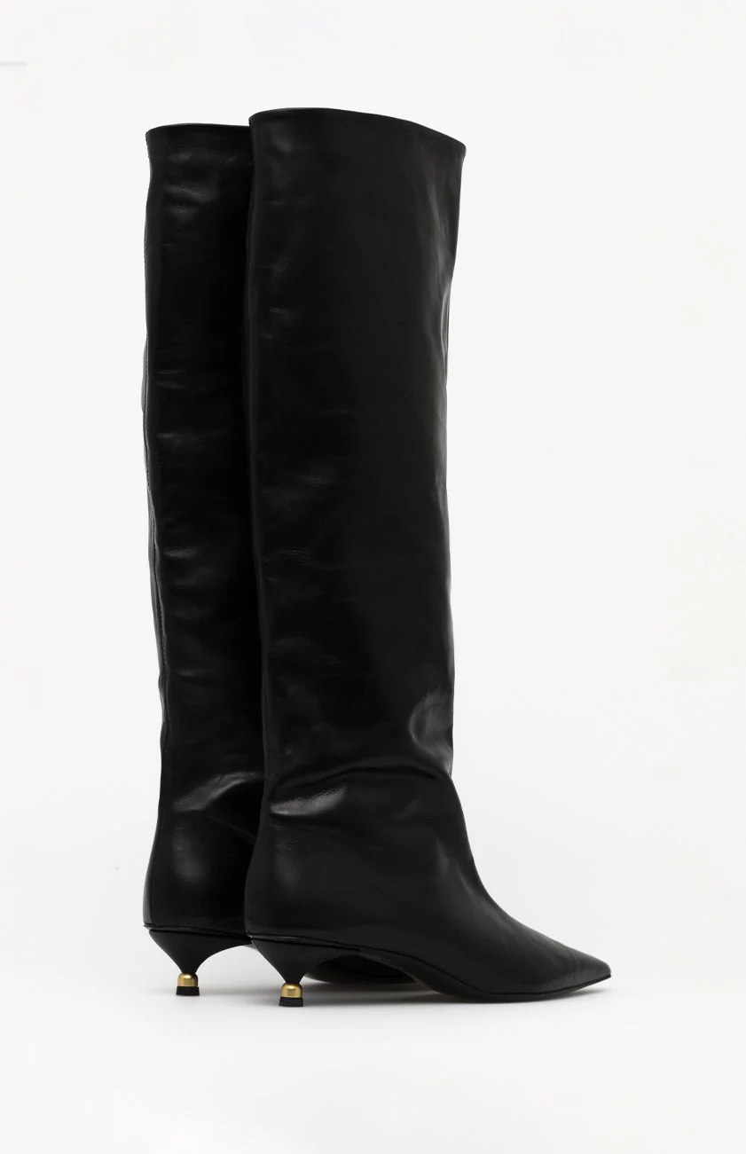 Klasyczne czarne kozaki o smukłym, szpiczastym nosku. Cholewka wykonana z wysokiej jakości naturalnej skóry, która miękko układa się na nodze. Prosty krój sięgający poniżej kolana sprawia, że model jest uniwersalny i ponadczasowy.