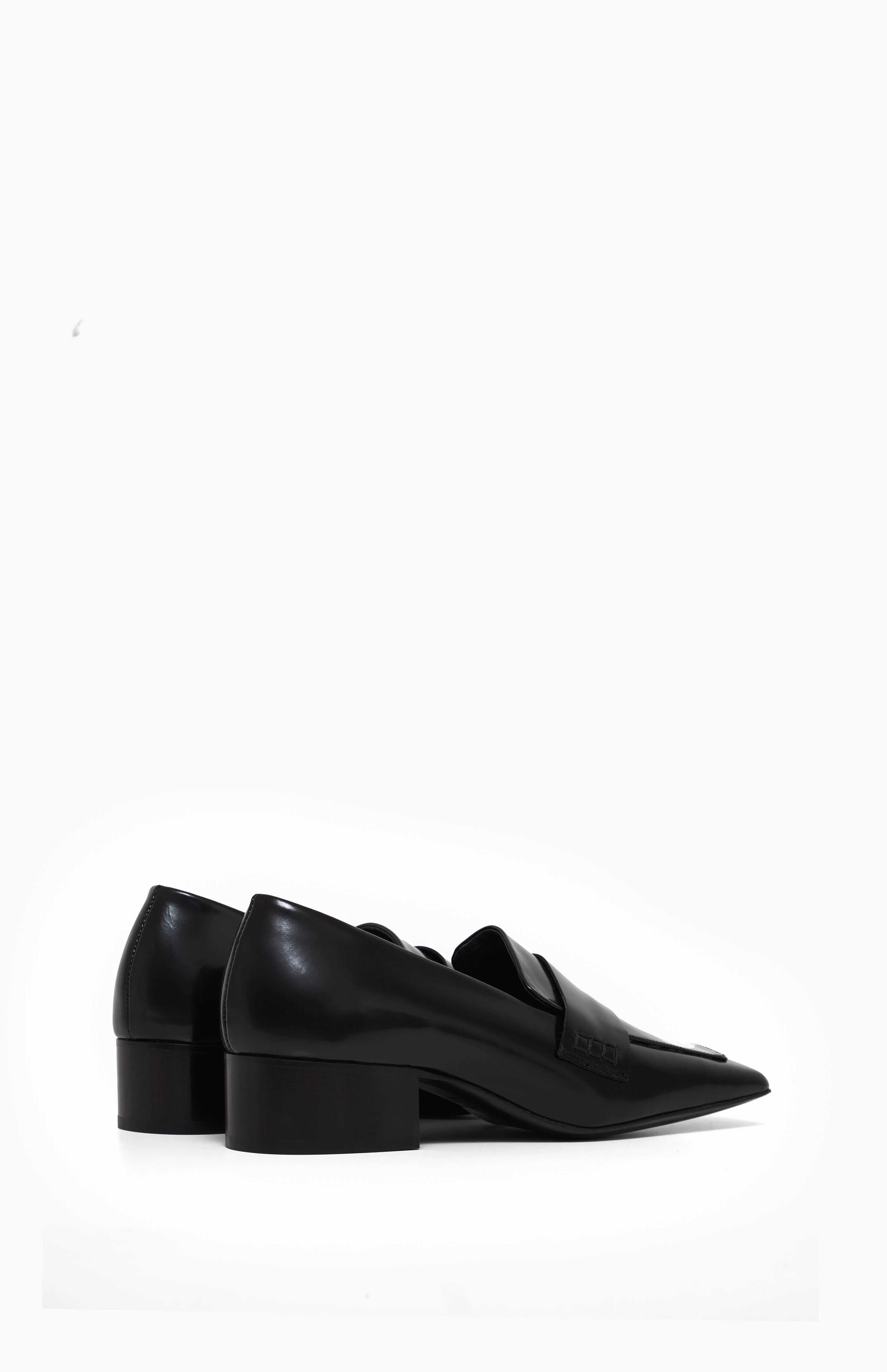 Czarne mokasyny na 35-milimetrowym obcasie. Wyróżniają się szerokimi prostokątnymi noskami, które przełamują tradycyjny krój. W całości wykonane z wysokiej jakości skóry naturalnej sprowadzanej z Włoch i montowanej w Polsce.