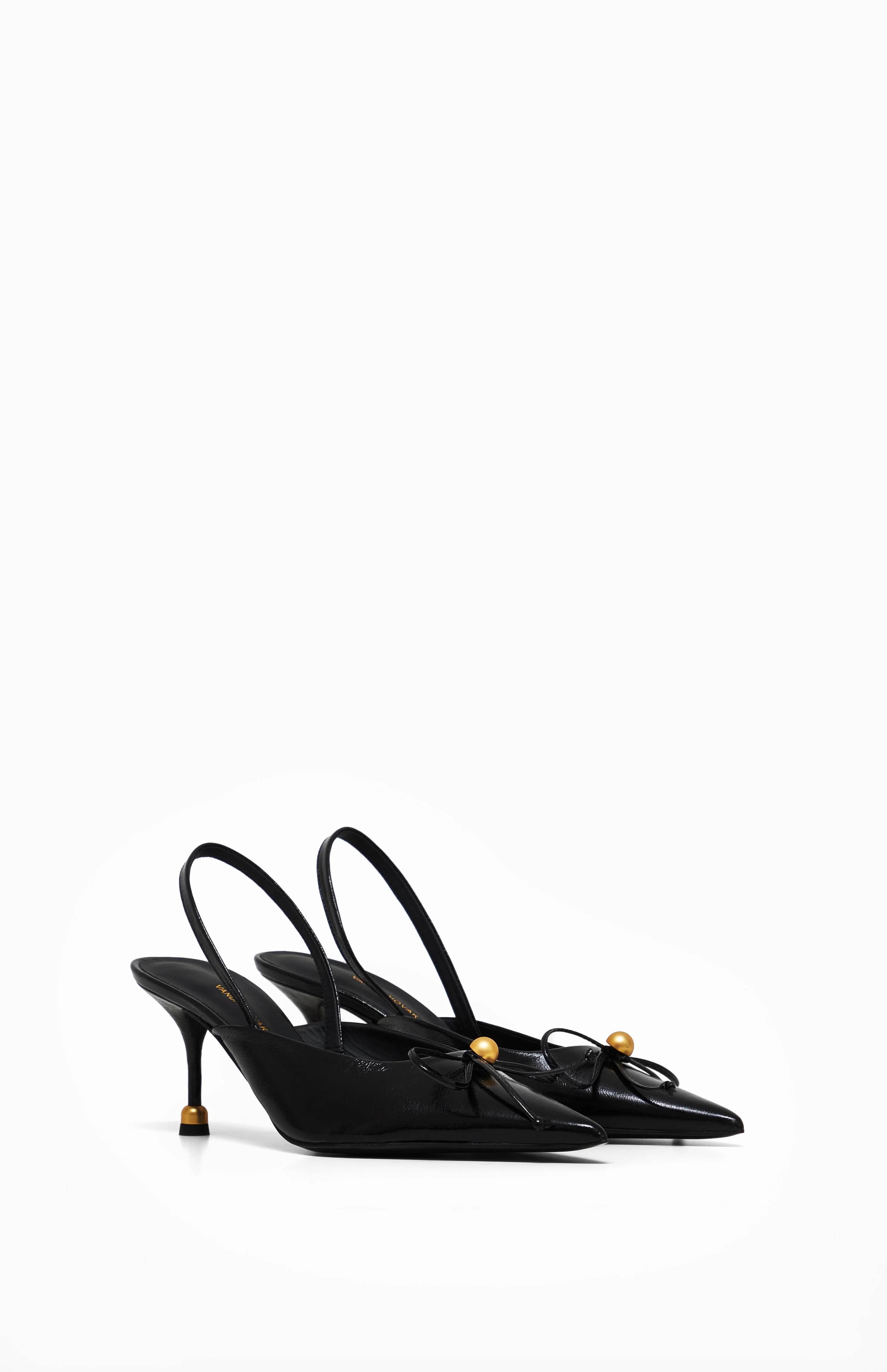 Wysoki obcas został zwieńczony małą złotą kulką. Ten charakterystyczny dla marki Vanda Novak detal, świetnie stabilizuje całą konstrukcję. Subtelna kokardka umieszczona na środku buta, ozdobiona złotą kulką, nawiązuje bezpośrednio do biżuteryjnego akcentu na obcasie.