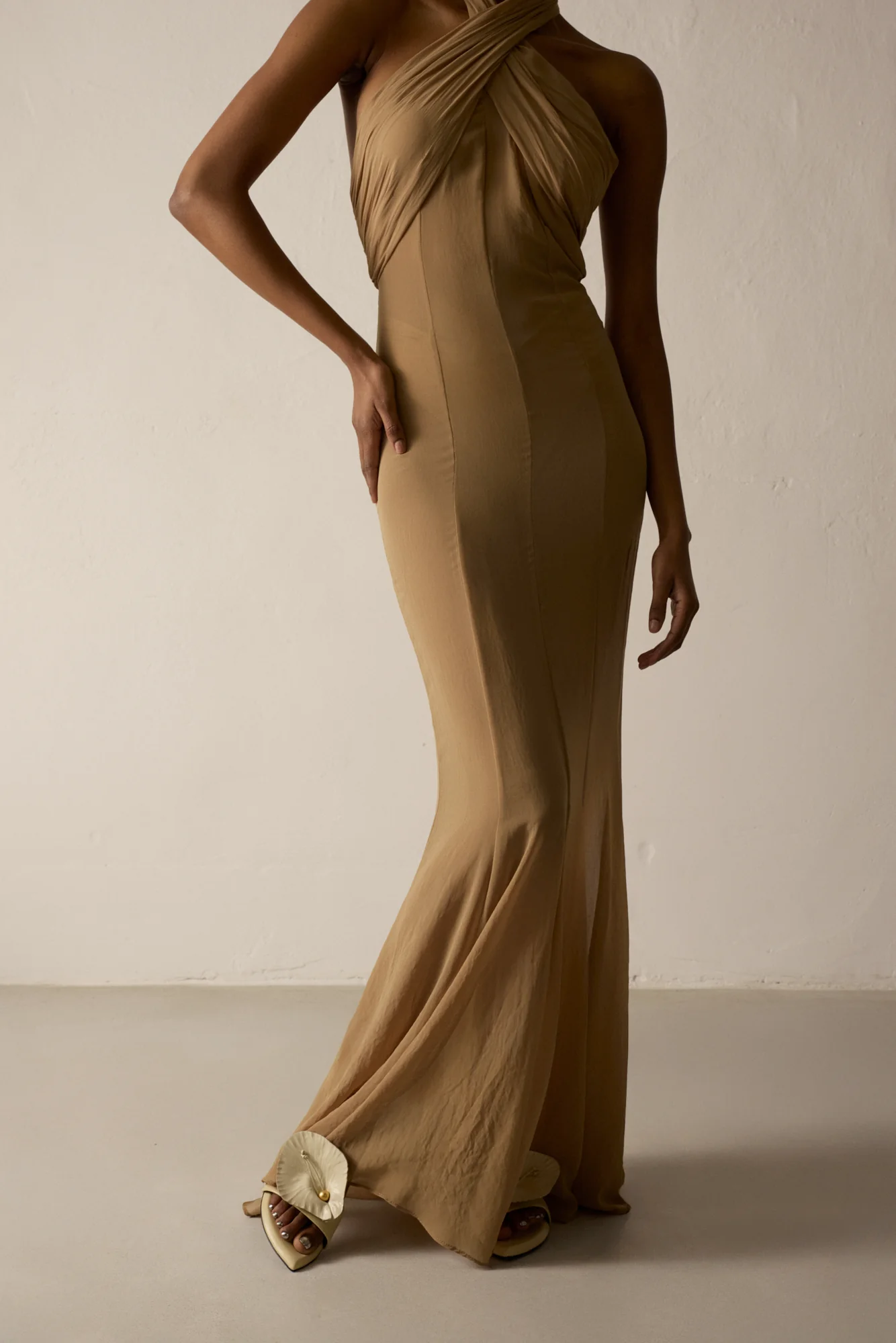 Kobiece, lekkie klapki na płaskiej podeszwie w jasnym kolorze kości słoniowej. Zdobione kwiatem w kształcie orchidei, zamocowanym na pasku przebiegającym z przodu stopy.
