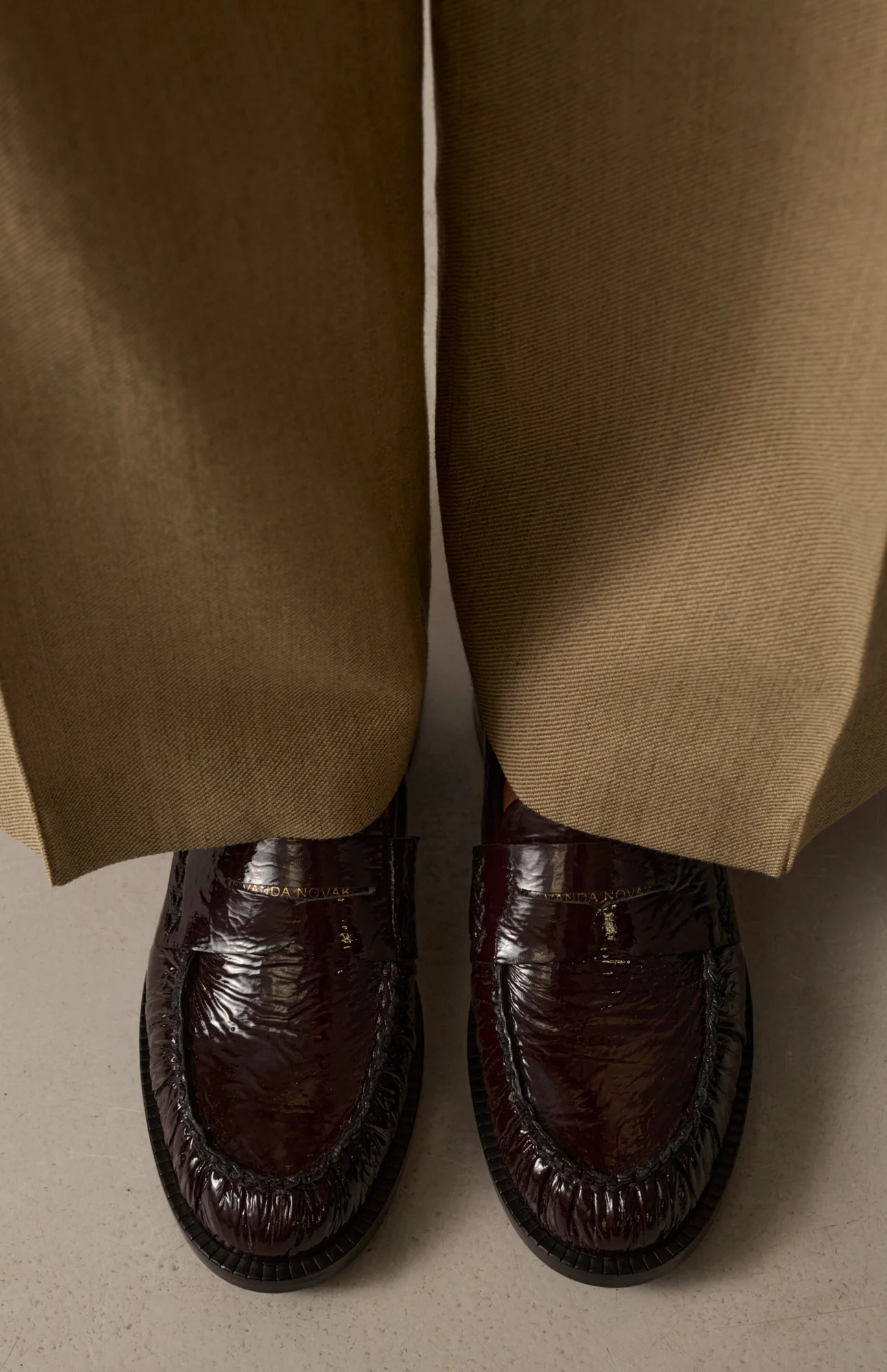 Cholewka została wykonana z naturalnej skóry naplak — miękkiej, elastycznej i subtelnie błyszczącej, dzięki czemu zachowuje elegancki połysk bez charakterystycznej dla lakieru sztywności. Mocne przeszycia oraz złota nazwa marki wytłoczona na przednim pasku podkreślają szlachetny charakter.
